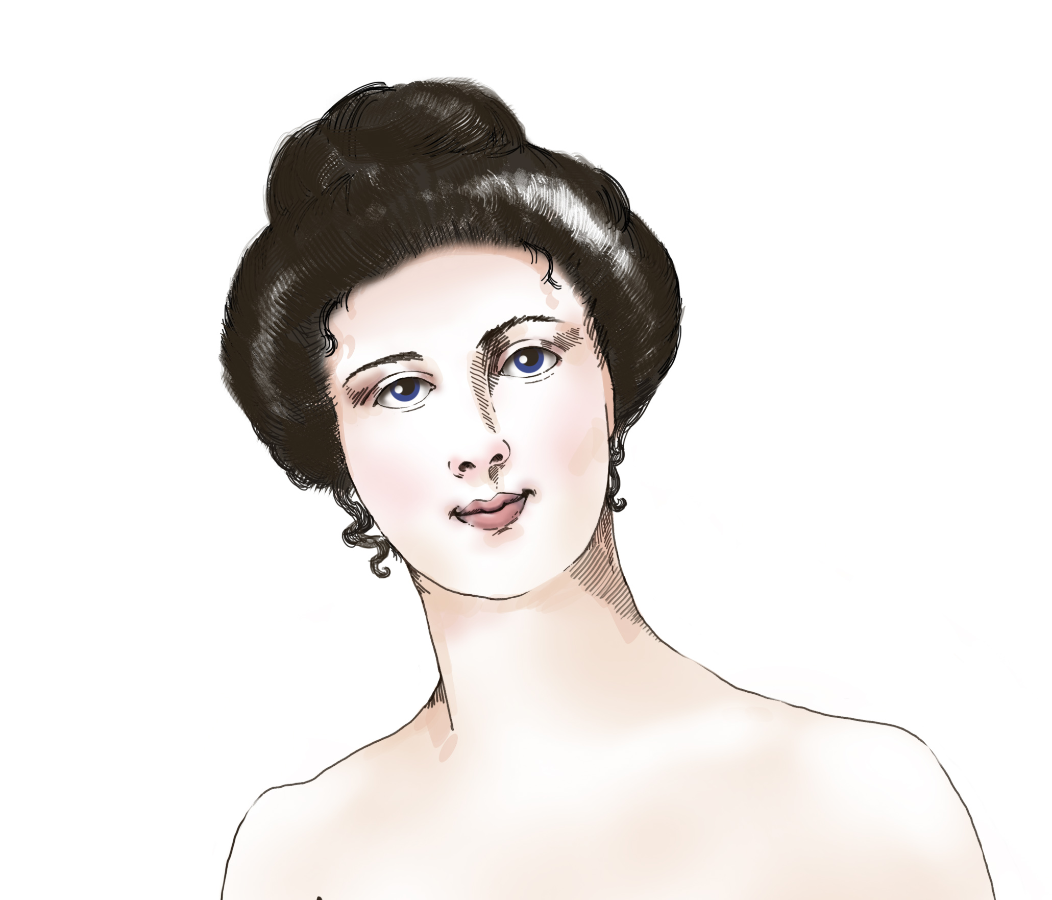 I’ve got the basic body for the 1911 Project paper dolls mostly complete… just need to do a little more rendering/painting to make her look a little more three-dimensional, add some more color, and fine tune with some crosshatching to mimic the period engraving look. Now to research the unmentionables she will wear, then work on the fashions! Here’s her lovely face:
