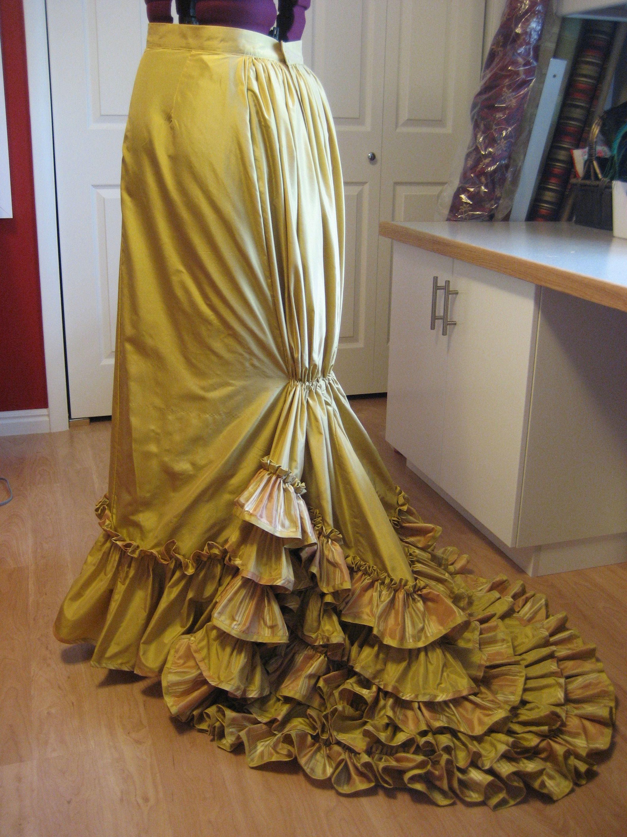 I had a bit different idea in mind when I started this dress, and after seeing the first few rounds of ruffles on the train, I decided to keep to the ruffle theme and so, box pleats which were going to be on the front turned into a tall ruffle instead. All of the ruffles are edged with handmade bias tape in a contrasting fabric to the main ruffle color. The colors are subtle and hard to see in the photograph although much more vibrant in person – for the pattern I have a striped silk taffeta in colors of peach, taupe, cream and golden yellow, while for the solid I have a silk taffeta in a plain golden yellow. This is a very different color choice for me as I usually tend to like darker, richer jewel colors, but it has been fun to work with. And I am loving silk taffeta…. this taffeta is SO crispy and nice and keeps whatever shape I make out of it.