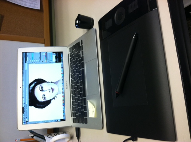 I have been in the market for a graphics tablet at home for quite a while now, but just could not justify the cost. I’ve been watching prices for a while hoping to jump on a bargain when I see it. With the recent release of the new Wacom Intuos5, the Intuos4 is still available but at discounted prices as retailers close out old models to make room for the new. After reading about numerous driver problems with the 5, I decided to take a chance on the less expensive, closeout 4. I found a factory refurbished, even cheaper version of the 4, and with a cash back bonus balance on one of my credit cards, I was able to get this tablet at next to nothing compared to the price of a new 5. I decided on a small tablet, since it’s about the same size as my Air laptop and thus would be able to easily fit in the same bag for toting around. The tablet showed up on my doorstep a couple of days ago and I have been playing with it ever since. The only word I can use to describe this piece of electronic gadgetry is “addictive”…. holy cow! I am seriously surprised to learn what I’ve been missing. This thing is a dream to use, the learning curve is very small, and the results look like something straight out of my physical sketchbook, but with the added ability to layer, erase, move, and duplicate without destroying any of the parts of the artwork that I want to keep. The colors are endless, the brush styles numerous, and I have been enjoying being able to paint and draw again without all the mess and fuss of real paint and ink (which I still adore, but it’s just not as convenient or as portable). Here’s the tablet: