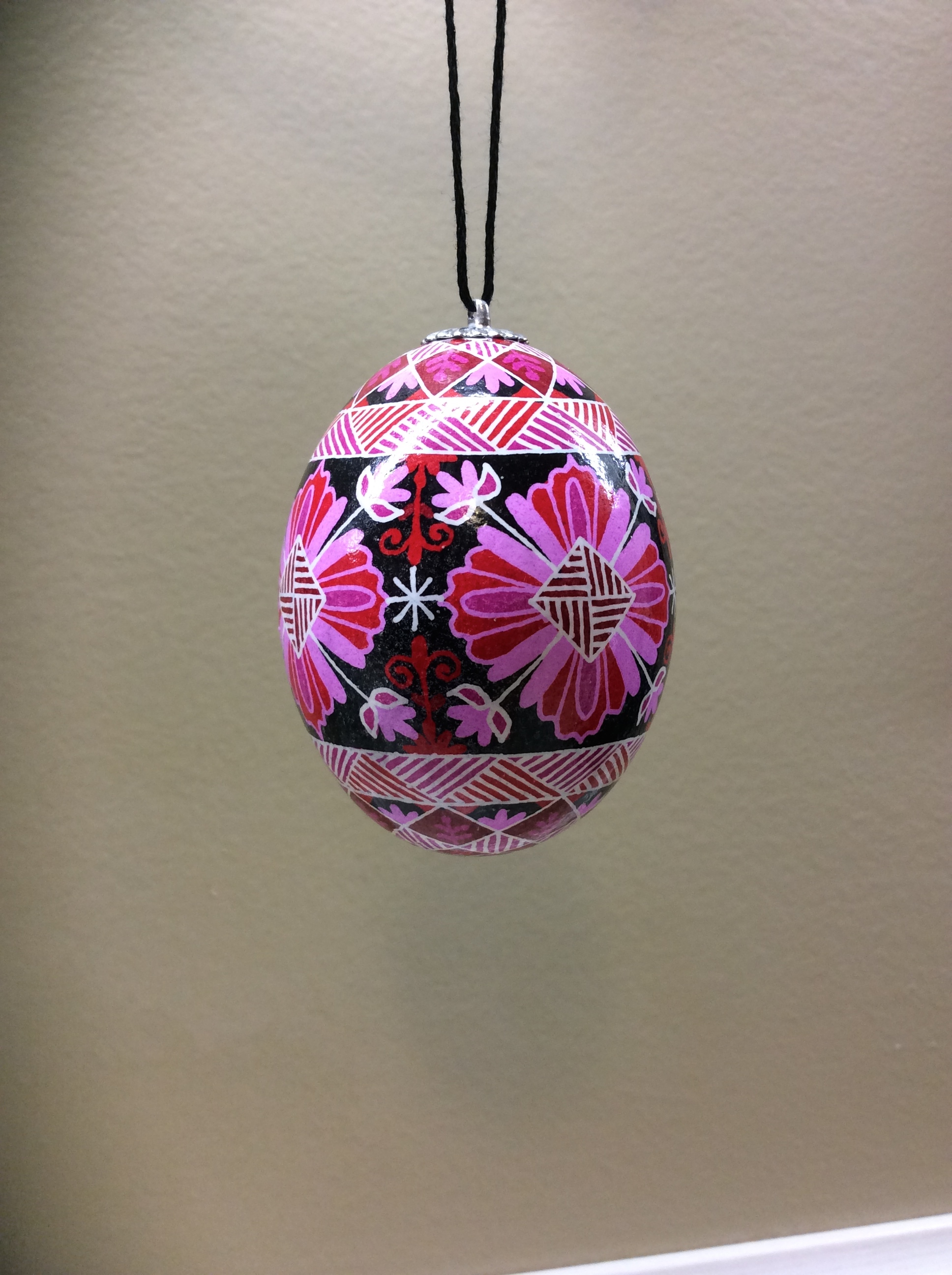 This is an example of what is commonly known here as Ukrainian style egg art, although it’s practiced in lots of countries in eastern Europe besides Ukraine. In Slovakia, where my husband is from, these decorated eggs are known as “kraslice”. The eggs are blown, prepared, and then dyed with several layers of color using a beeswax-resist process very similar to batik on fabric. Then the dye is removed to reveal the jewel like colors underneath… the reveal is the best part of the entire process, because you never know exactly what you’re going to get, despite even the best efforts to anticipate the design layers and the combination of dye colors on top of each other.